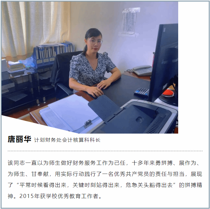 这几年间,她也曾为完成某项工作冒着瓢泼大雨去学校,为简化报账流程熬夜到凌晨,为提升财务信息化服务水平,更是坚持两个月假期里工作到深夜……践行不忘初心,服务群众的使命担当。